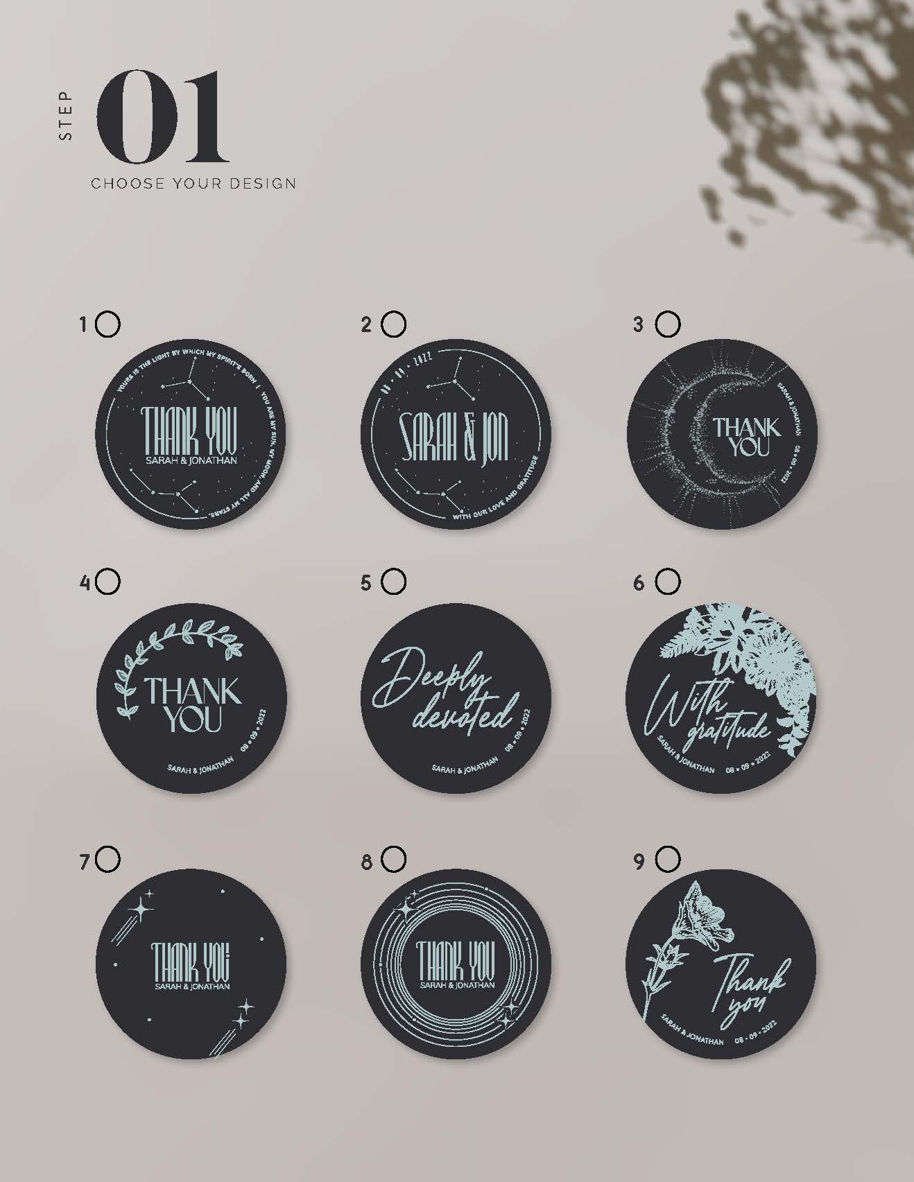 We have 9 incredible professionally designed labels to choose from that can be further customized in the next steps with your own colours and texts!