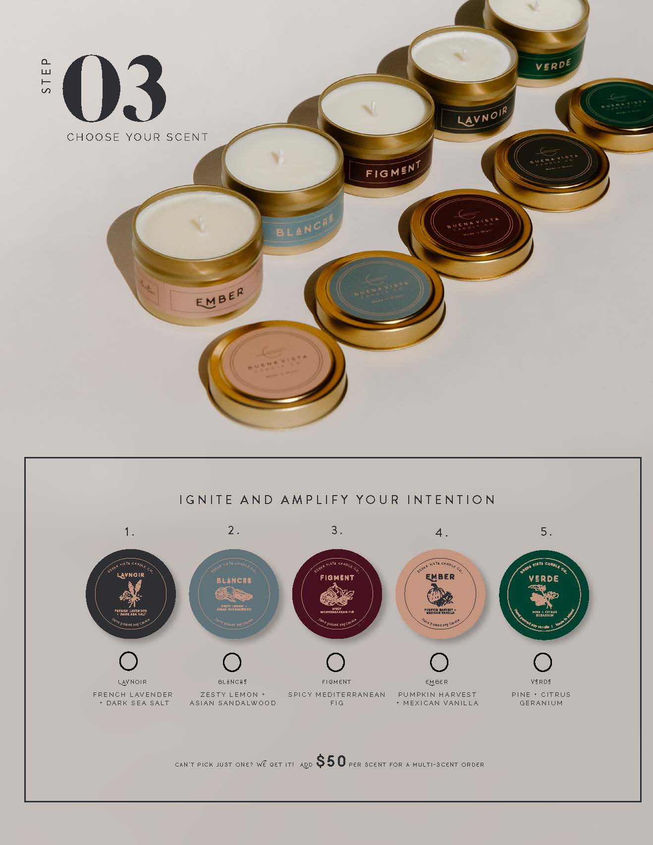 We have 5 gorgeous signature scents to choose from here at Buena Vista Candle Co!